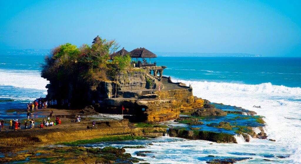 Finally, visit Tanah Lot Temple, a rock formation off the coast of the Indonesian island of Bali. Home to the ancient Hindu pilgrimage temple of Tanah Lot, this site is a popular tourist and cultural icon for photography.